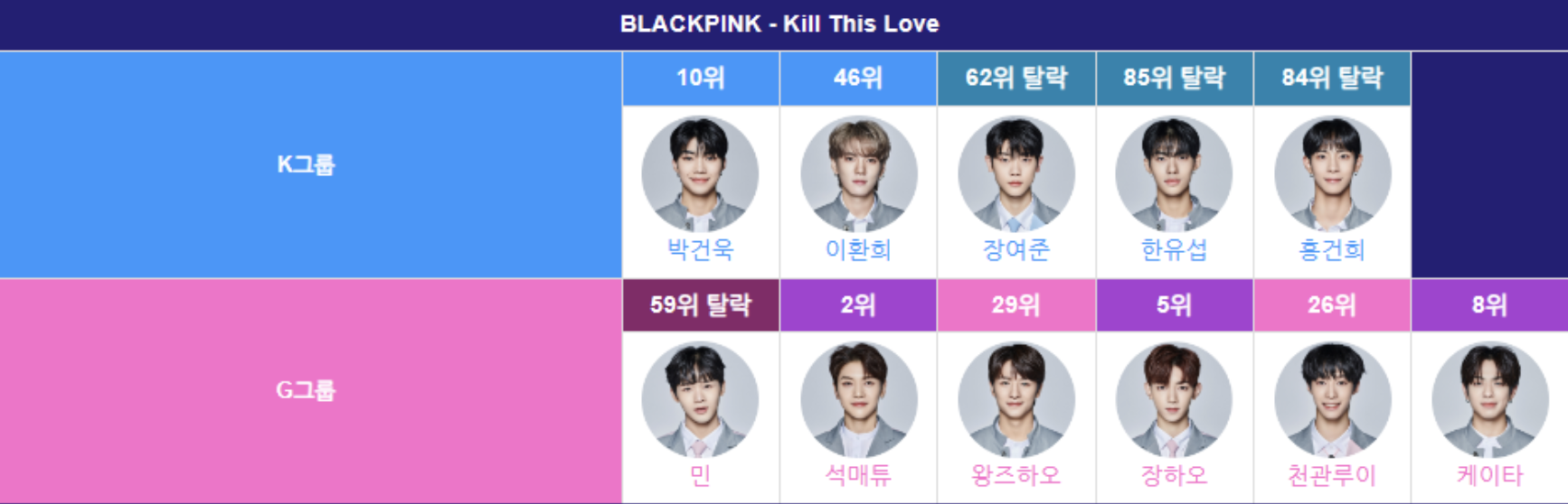 블랙핑크의 킬 디스 러브 팀에 생존자가 많지 않을 것이라는 많은 기대에도 불구하고 G조에는 의외로 생존자가 많았다. 다섯 명의 생존자가 데뷔조에 포함되었다. 박건욱은 아쉽게도 10위를 기록하며 데뷔조에 오르지는 못했지만 가능성을 보았다.