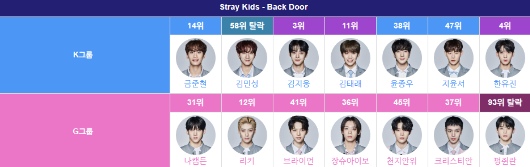 스트레이 키즈 ‘백도어’에서 김민성과 팽준란만 탈락하고 모두 살아남았다. 한유진은 4위로 데뷔조에 진입했고 크리스찬도 37위로 꽤 높은 순위를 기록했다. 개인적으로 캠든이 잘됐으면 좋겠는데 의외로 리키가 순위가 높았다. 아마 중국인들이 좋아하는 얼굴형이 아닐까 싶다.