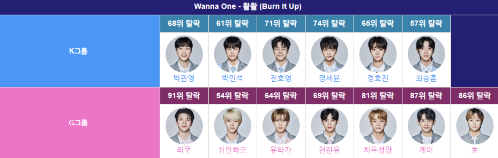워너원의 포효는 K그룹과 G그룹 멤버 전원이 탈락해 아쉬움을 남겼다. 리더 박민석이 정말 잘해줘서 기대가 컸는데 경쟁의 세계가 잔인한건 사실이다.