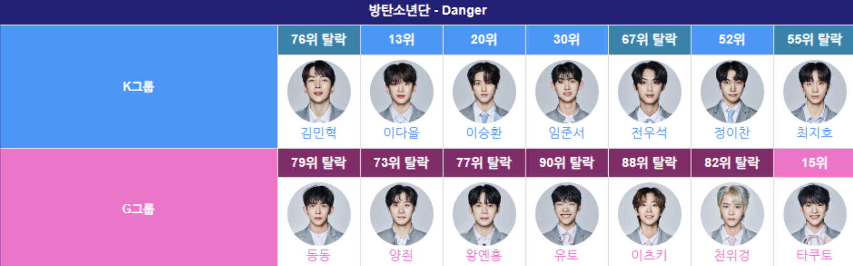 먼저 방탄소년단 팀의 데인저 팀이었다. 이다을, 이승환, 정이찬, 임준서는 살아남았고, 아쉽게도 G그룹 타쿠토는 단 한 명만 살아남았다. 이다을의 경우 보이즈플래닛 전 방송인 4회에서 자신의 자리를 고집하면서 순위가 소폭 하락한 듯했다. 하지만 아직 13등이니 기대해볼 만하다.
