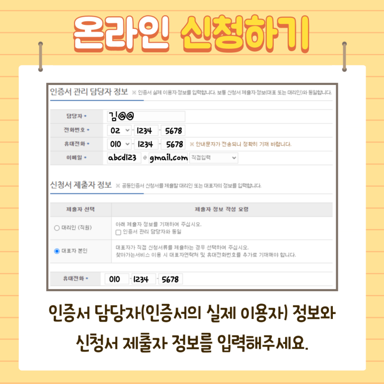 신청서를 제출하는 사람이 대표자라면 신청서 원본, 사업자등록증 사본, 대표자 신분증 사본을