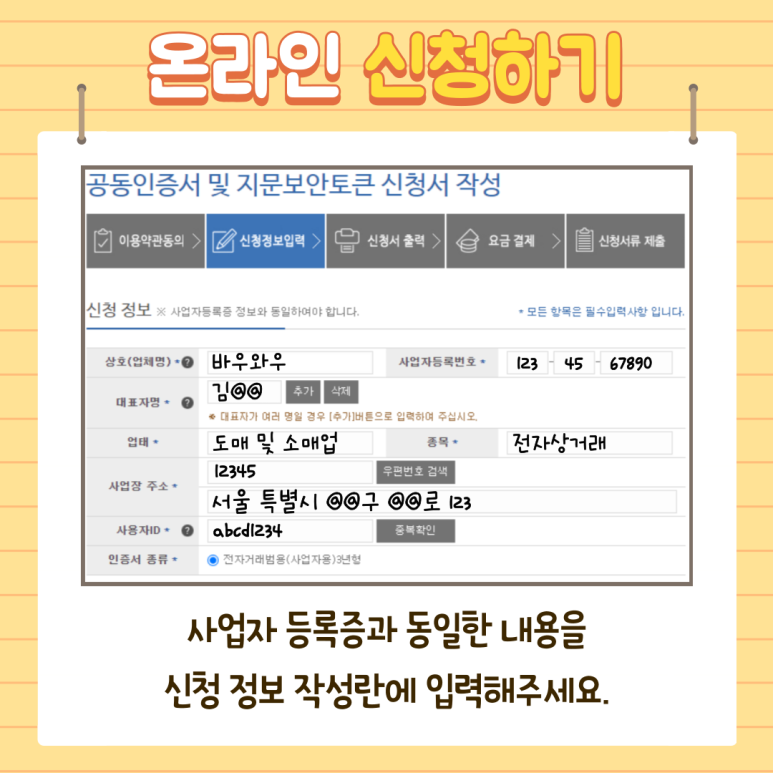 다음으로 신청정보를 입력합니다. 상기 작성 예를 참고하여 사업자 등록증과 같은 내용을 작성해 주십시오.